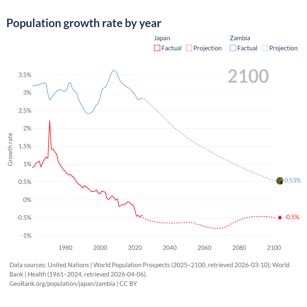 - For the last 10 years, Japan has had an average growth rate of -0.25% per year vs +3% in Zambia.