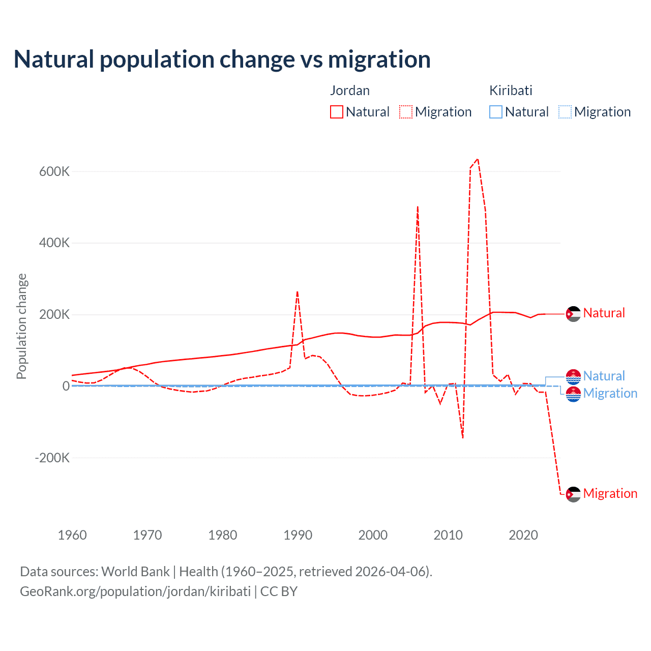 Over the last 10 years, 63.2% of the population change in Jordan is from natural causes (a gain of 1,991,452 people) and 36.8% is from migration (a gain of 1,157,625 people). In Kiribati 80% is from natural causes (a gain of 25,262 people) and 20% is from migration (a loss of 6,330 people).