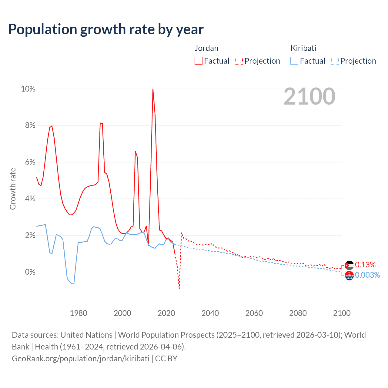 - For the last 10 years, Jordan has had an average growth rate of +3.45% per year vs +1.53% in Kiribati.