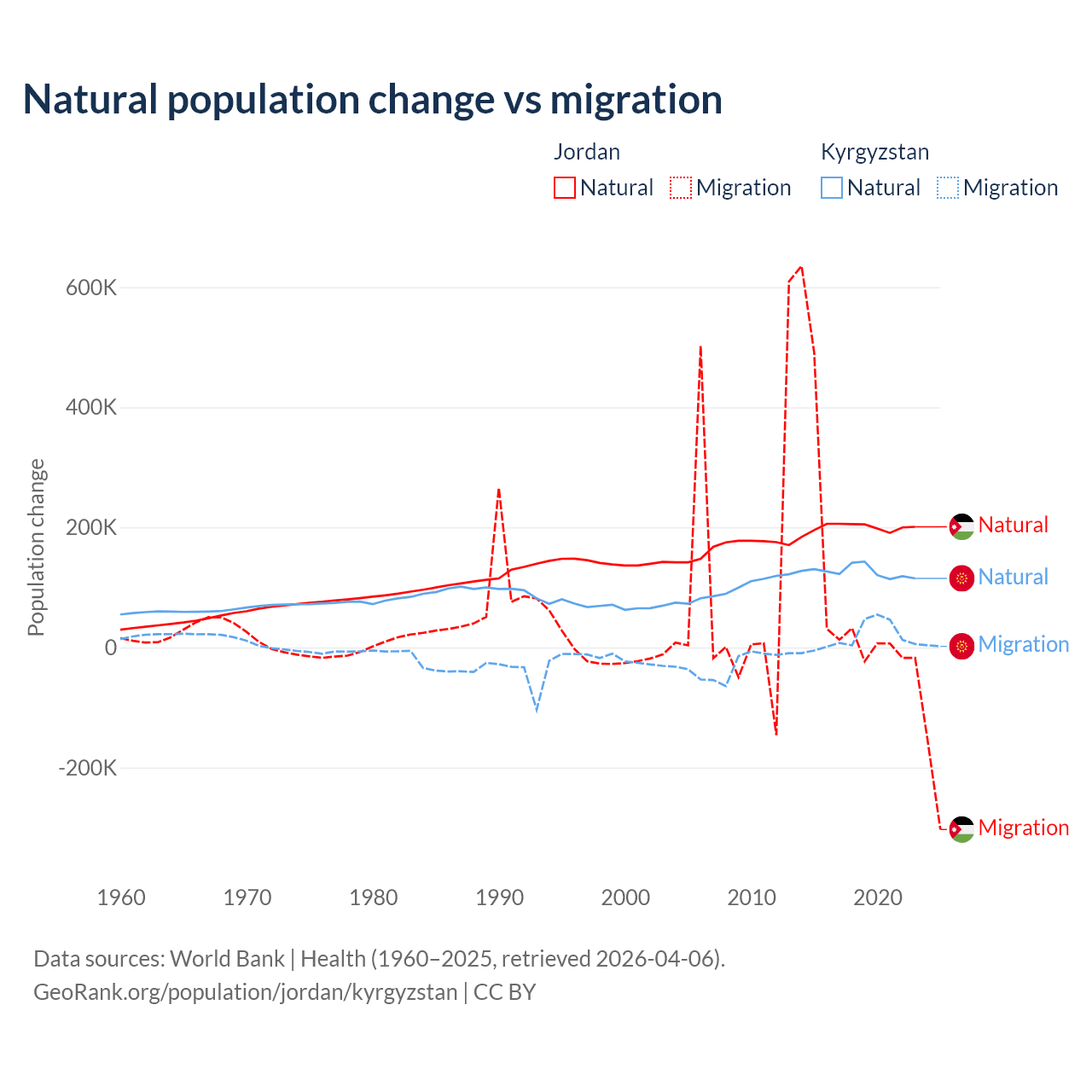 Over the last 10 years, 63.2% of the population change in Jordan is from natural causes (a gain of 1,991,452 people) and 36.8% is from migration (a gain of 1,157,625 people). In Kyrgyzstan 88.5% is from natural causes (a gain of 1,258,837 people) and 11.5% is from migration (a gain of 164,132 people).