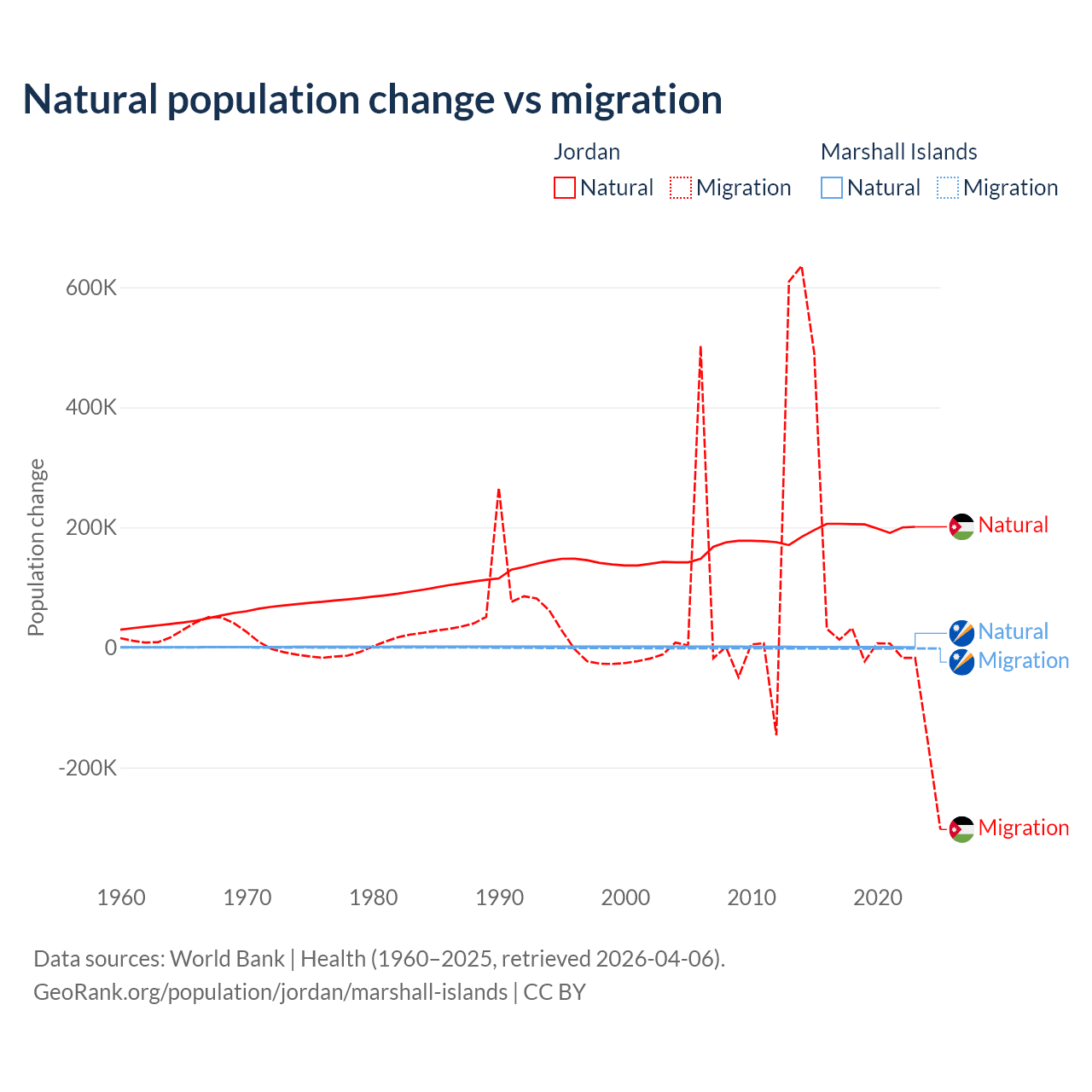 Over the last 10 years, 63.2% of the population change in Jordan is from natural causes (a gain of 1,991,452 people) and 36.8% is from migration (a gain of 1,157,625 people). In the Marshall Islands 27.8% is from natural causes (a gain of 7,592 people) and 72.2% is from migration (a loss of 19,682 people).