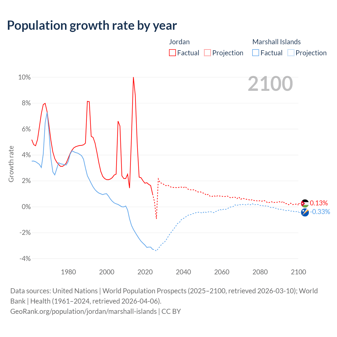 - For the last 10 years, Jordan has had an average growth rate of +3.45% per year vs -2.69% in the Marshall Islands.
