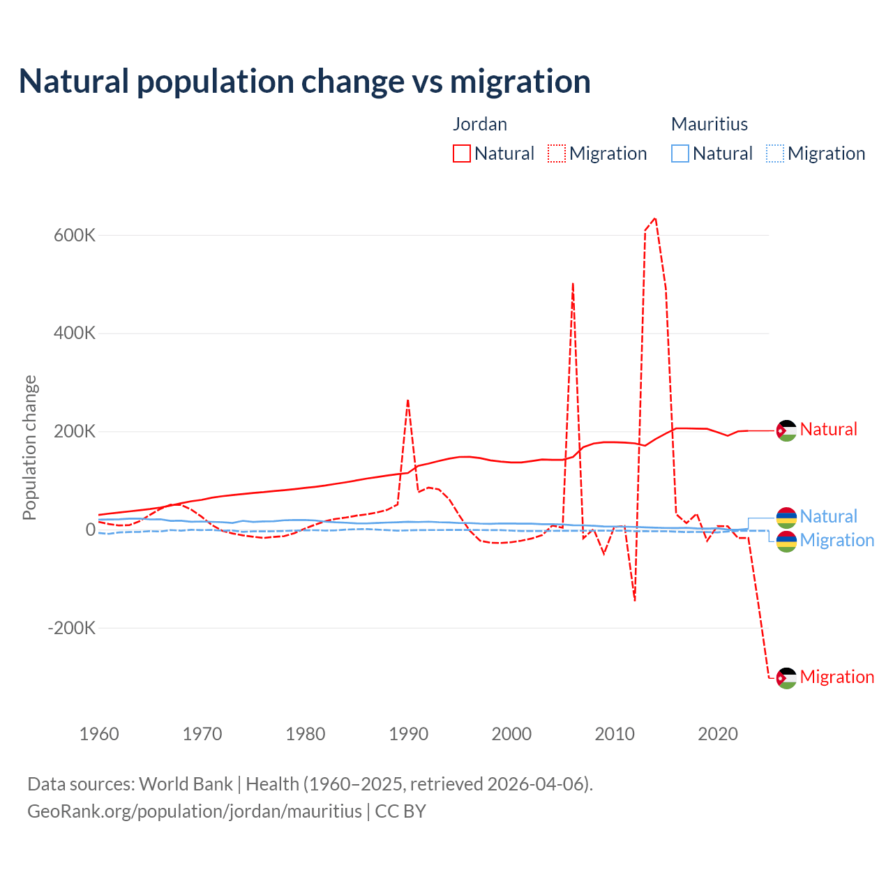 Over the last 10 years, 63.2% of the population change in Jordan is from natural causes (a gain of 1,991,452 people) and 36.8% is from migration (a gain of 1,157,625 people). In Mauritius 30.9% is from natural causes (a gain of 19,327 people) and 69.1% is from migration (a loss of 43,294 people).