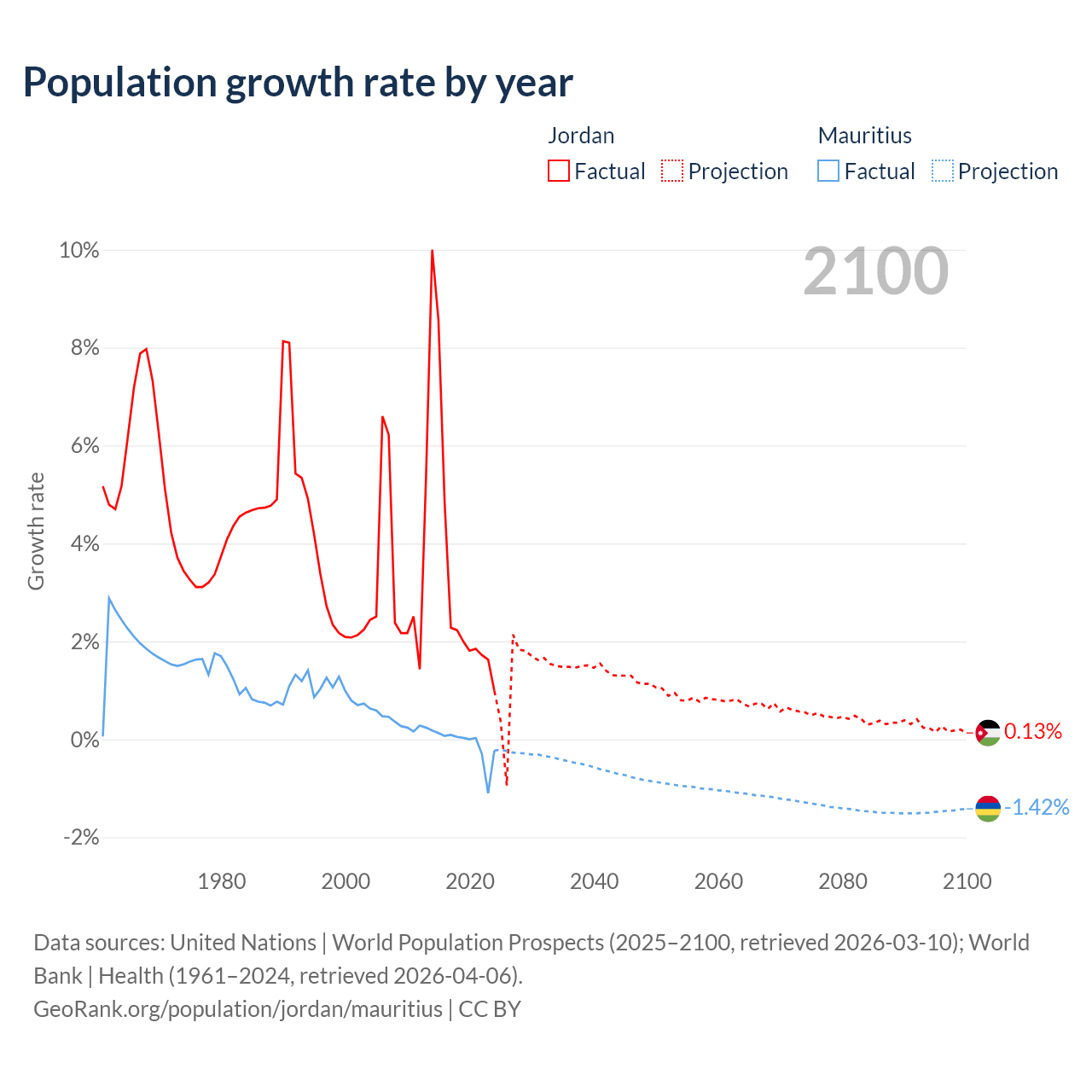 - For the last 10 years, Jordan has had an average growth rate of +3.45% per year vs -0.09% in Mauritius.