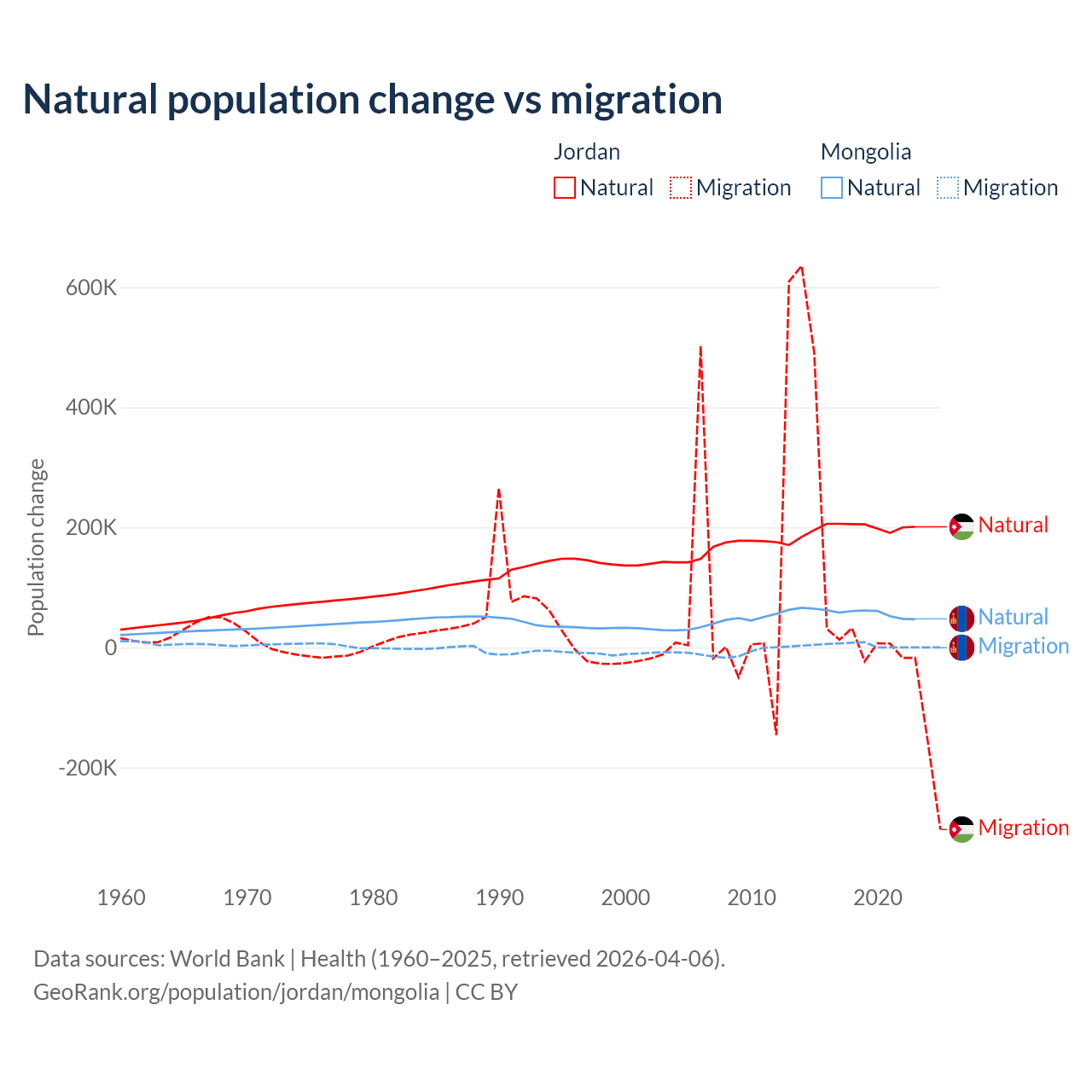 Over the last 10 years, 63.2% of the population change in Jordan is from natural causes (a gain of 1,991,452 people) and 36.8% is from migration (a gain of 1,157,625 people). In Mongolia 94.1% is from natural causes (a gain of 580,367 people) and 5.87% is from migration (a gain of 36,163 people).