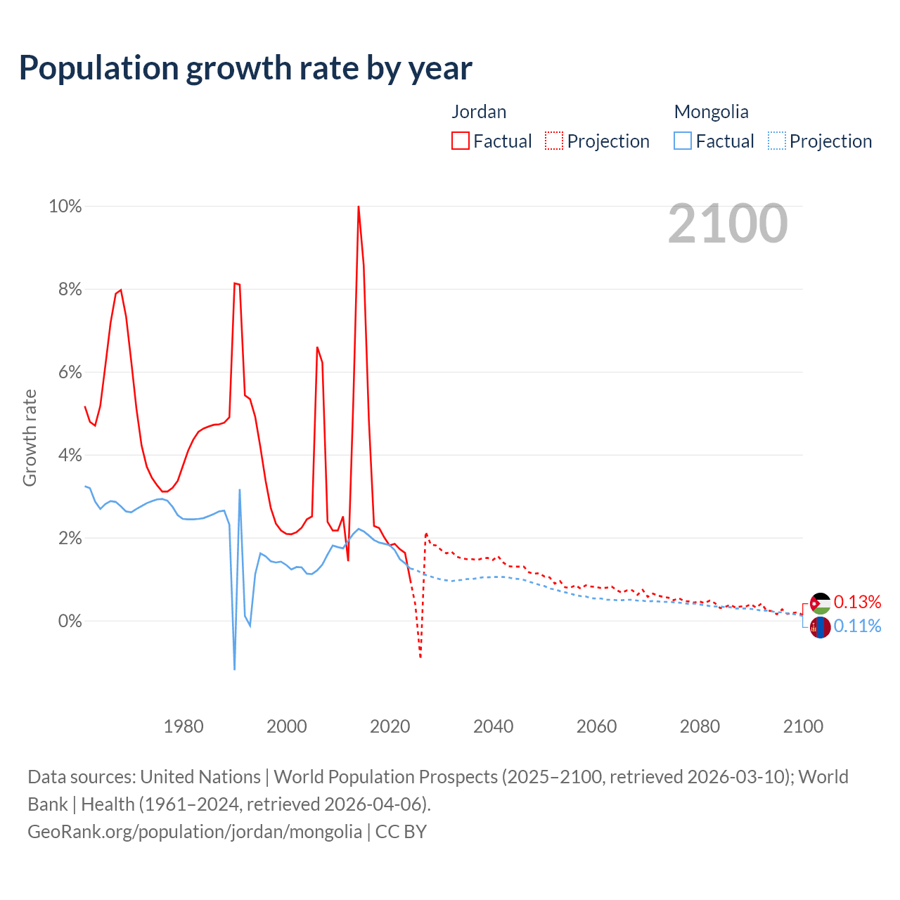 - For the last 10 years, Jordan has had an average growth rate of +3.45% per year vs +1.79% in Mongolia.