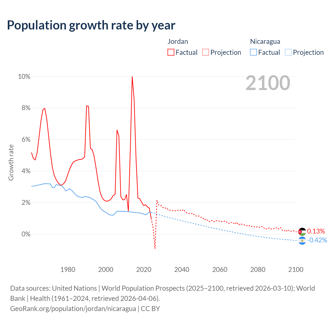 - For the last 10 years, Jordan has had an average growth rate of +3.45% per year vs +1.33% in Nicaragua.