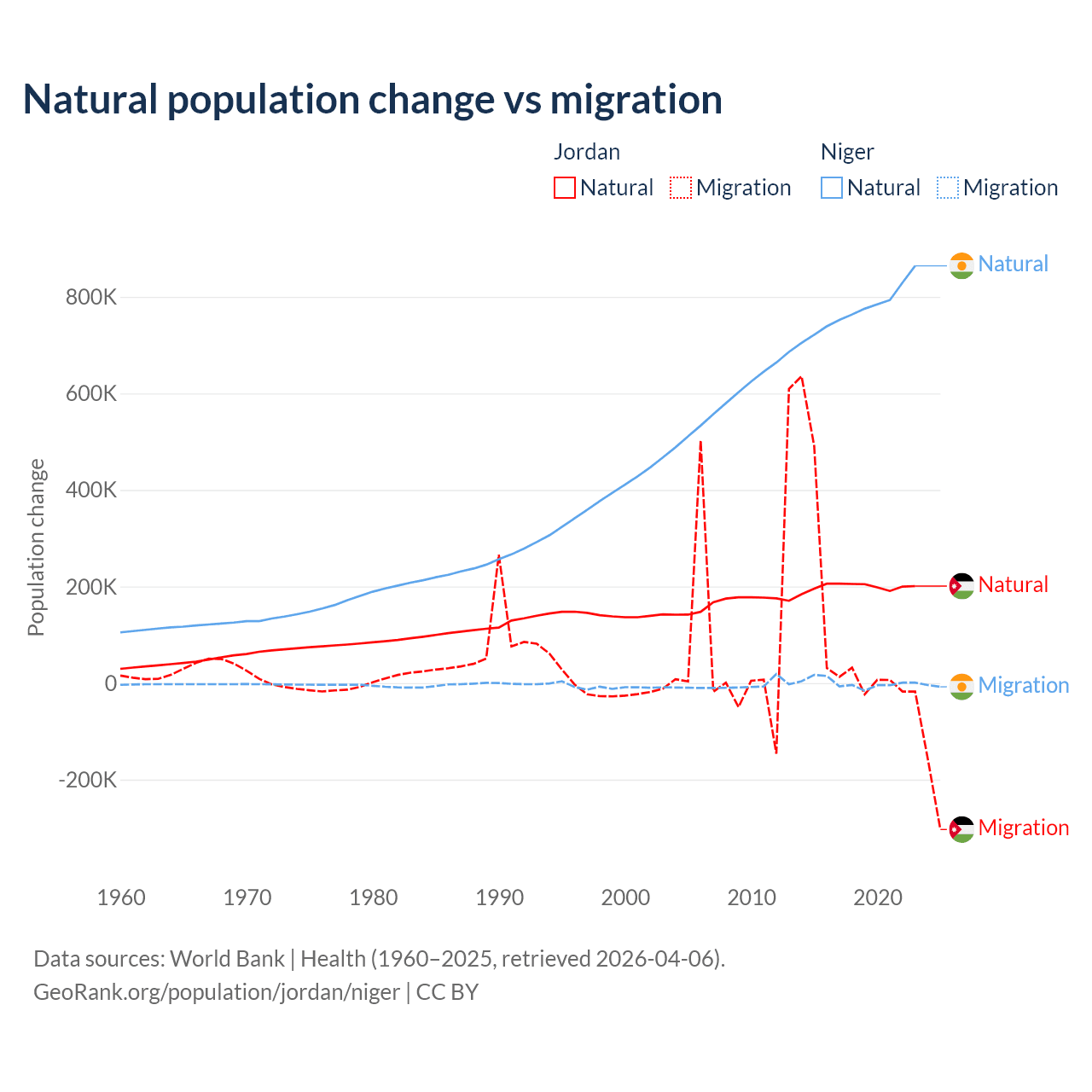 Over the last 10 years, 63.2% of the population change in Jordan is from natural causes (a gain of 1,991,452 people) and 36.8% is from migration (a gain of 1,157,625 people). In Niger 100% is from natural causes (a gain of 7,728,287 people) and 0.03% is from migration (a gain of 2,520 people).