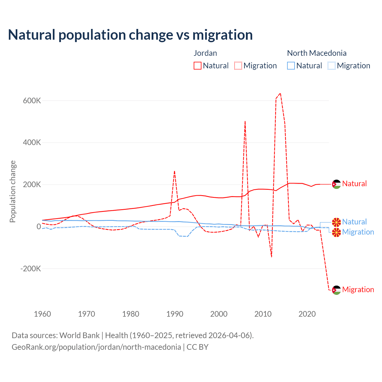 Over the last 10 years, 63.2% of the population change in Jordan is from natural causes (a gain of 1,991,452 people) and 36.8% is from migration (a gain of 1,157,625 people). In North Macedonia 6.45% is from natural causes (a loss of 12,585 people) and 93.5% is from migration (a loss of 182,429 people).