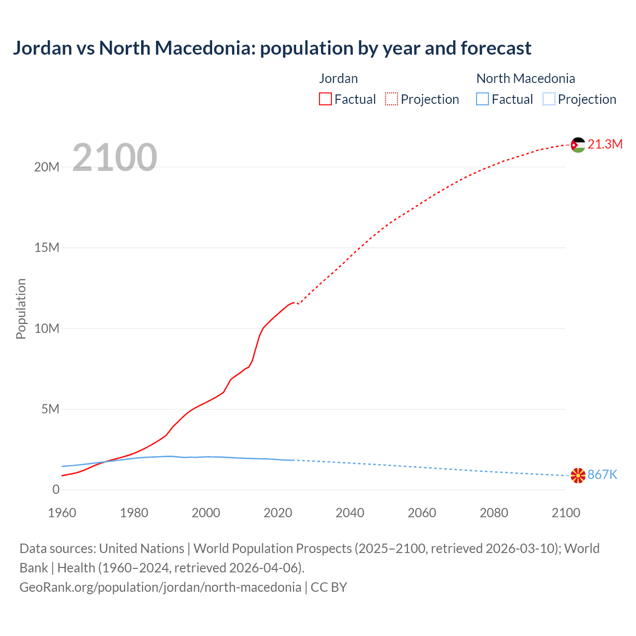 Jordan vs North Macedonia: population by year and forecast