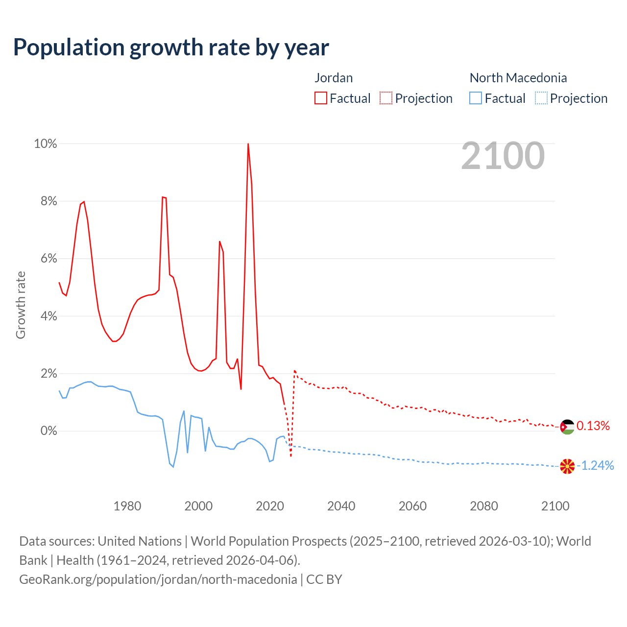 - For the last 10 years, Jordan has had an average growth rate of +3.45% per year vs -0.48% in North Macedonia.