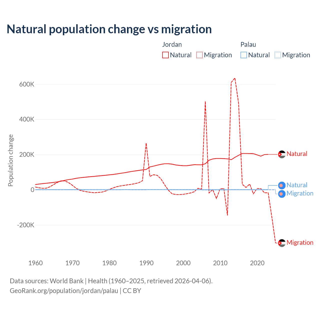Over the last 10 years, 63.2% of the population change in Jordan is from natural causes (a gain of 1,991,452 people) and 36.8% is from migration (a gain of 1,157,625 people). In Palau 53.8% is from natural causes (a gain of 264 people) and 46.2% is from migration (a loss of 227 people).