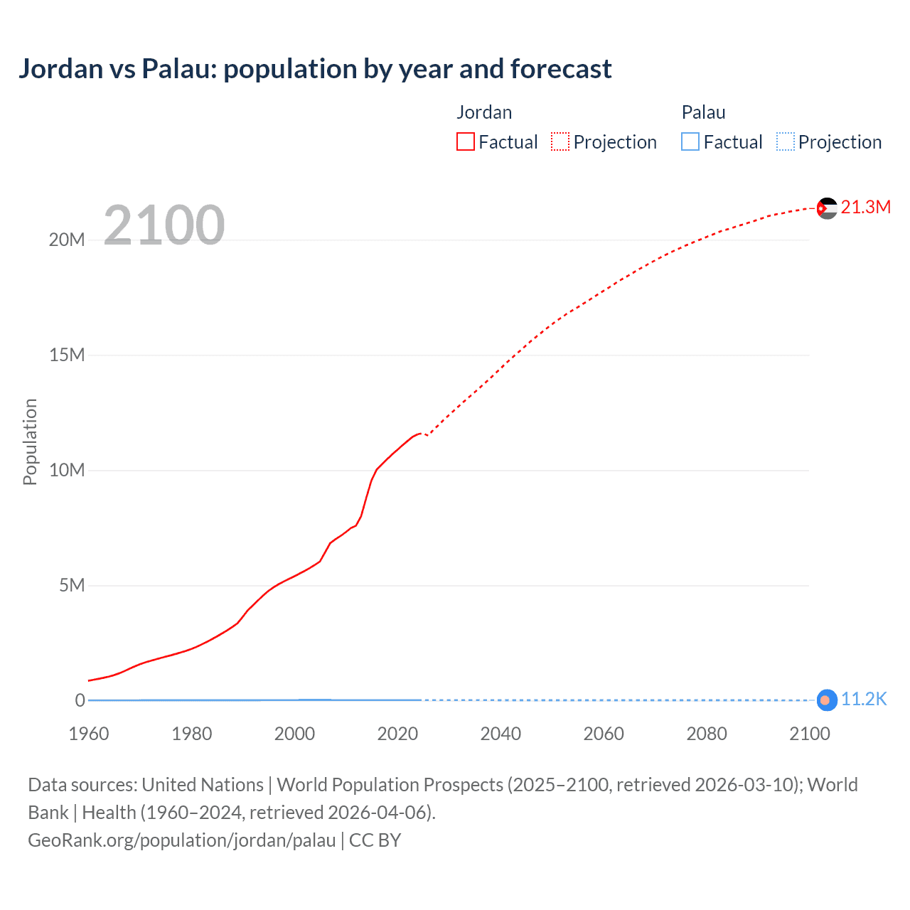 The latest officially reported population of Jordan was 11,552,876 in 2024 vs 17,695 people in Palau in 2024. In 2026, based on the adjusted UN estimation, the current Jordan's population is 11,555,022 people compared to 17,629 in Palau.