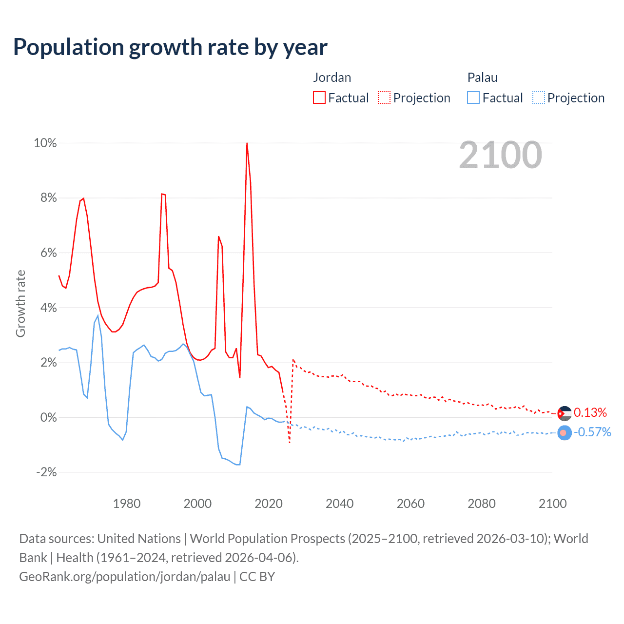 - For the last 10 years, Jordan has had an average growth rate of +3.45% per year vs +0.02% in Palau.