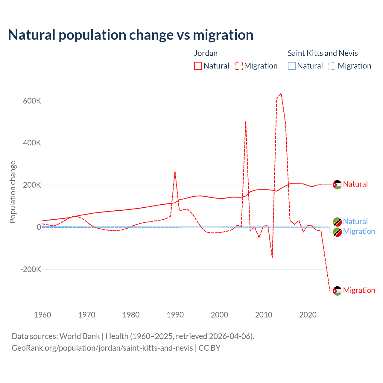Over the last 10 years, 63.2% of the population change in Jordan is from natural causes (a gain of 1,991,452 people) and 36.8% is from migration (a gain of 1,157,625 people). In Saint Kitts and Nevis 44.9% is from natural causes (a gain of 1,225 people) and 55.1% is from migration (a loss of 1,506 people).