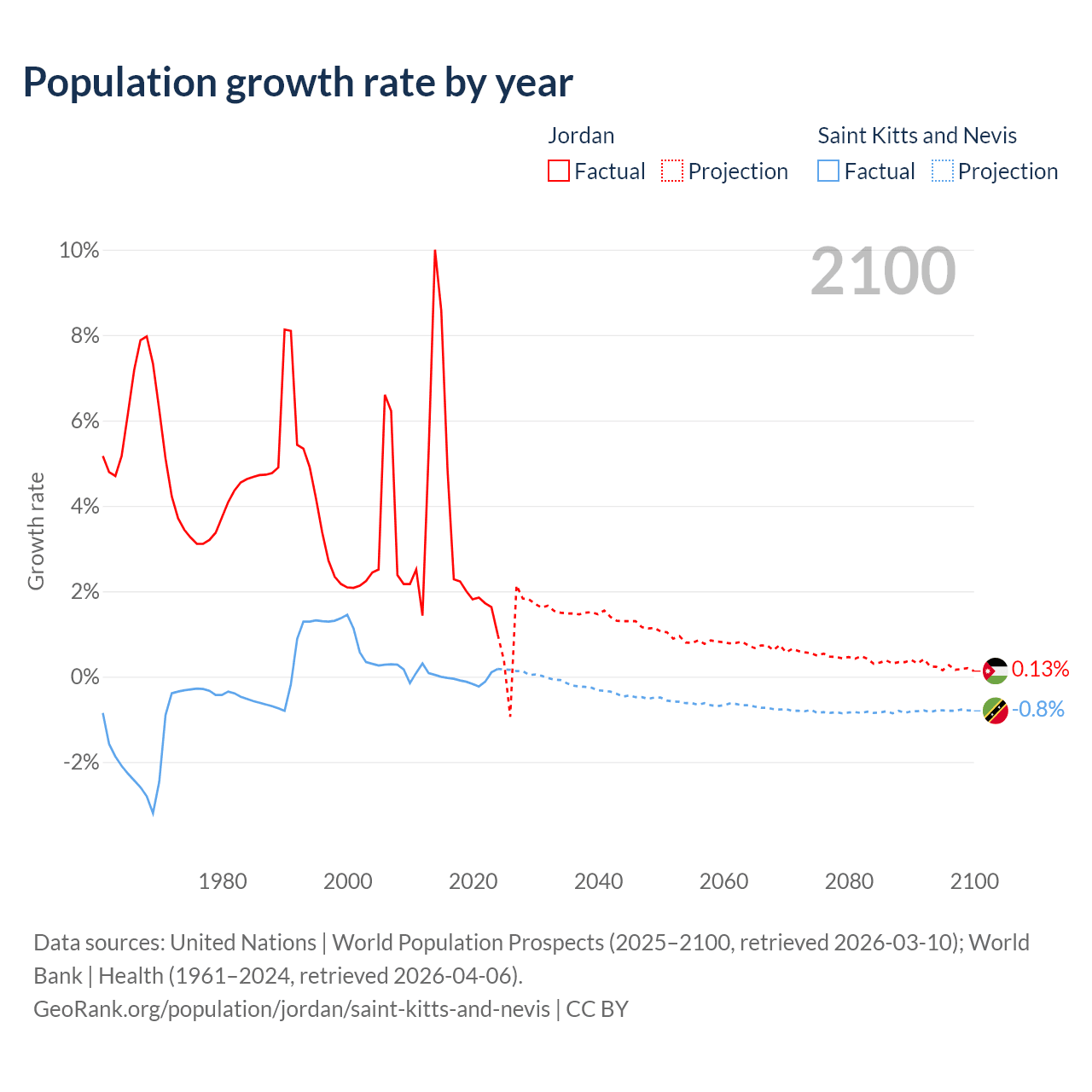 - For the last 10 years, Jordan has had an average growth rate of +3.45% per year vs -0.04% in Saint Kitts and Nevis.