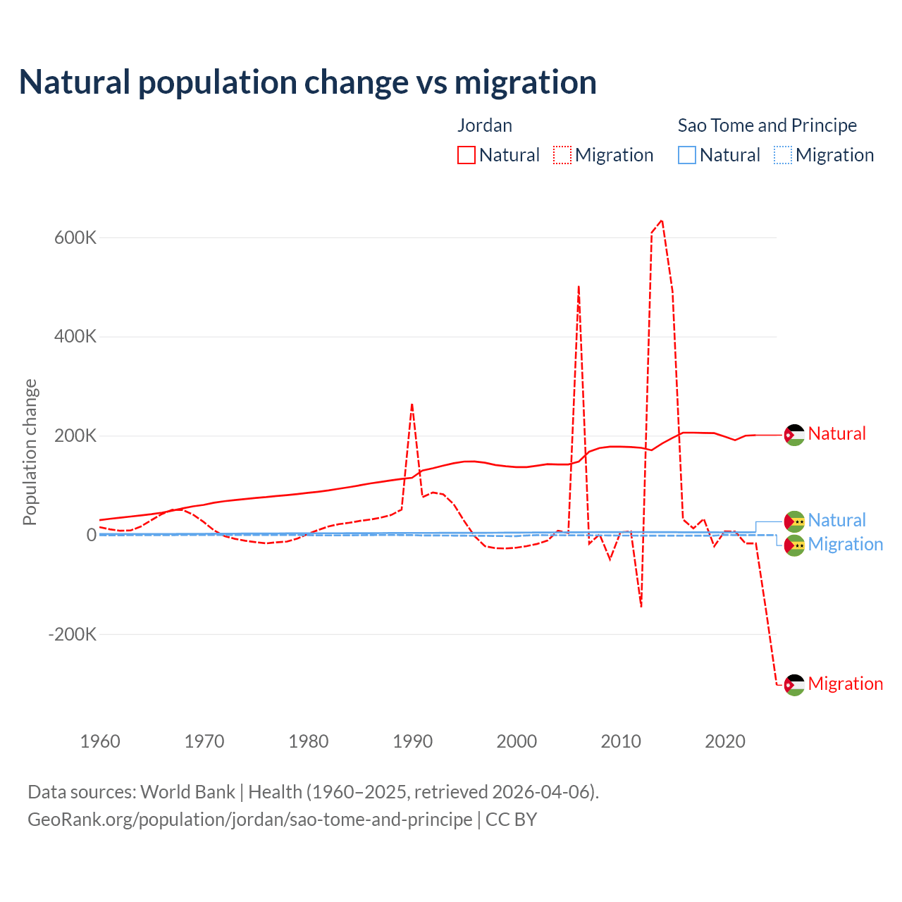 Over the last 10 years, 63.2% of the population change in Jordan is from natural causes (a gain of 1,991,452 people) and 36.8% is from migration (a gain of 1,157,625 people). In Sao Tome and Principe 80.1% is from natural causes (a gain of 50,822 people) and 19.9% is from migration (a loss of 12,621 people).