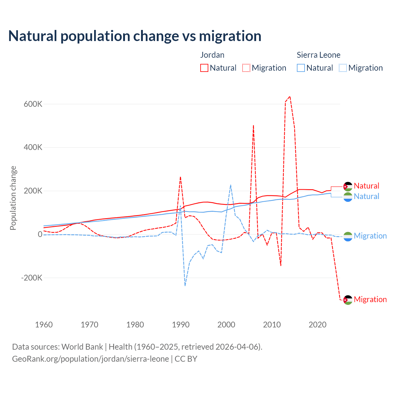 Over the last 10 years, 63.2% of the population change in Jordan is from natural causes (a gain of 1,991,452 people) and 36.8% is from migration (a gain of 1,157,625 people). In Sierra Leone 99.6% is from natural causes (a gain of 1,764,049 people) and 0.41% is from migration (a loss of 7,211 people).