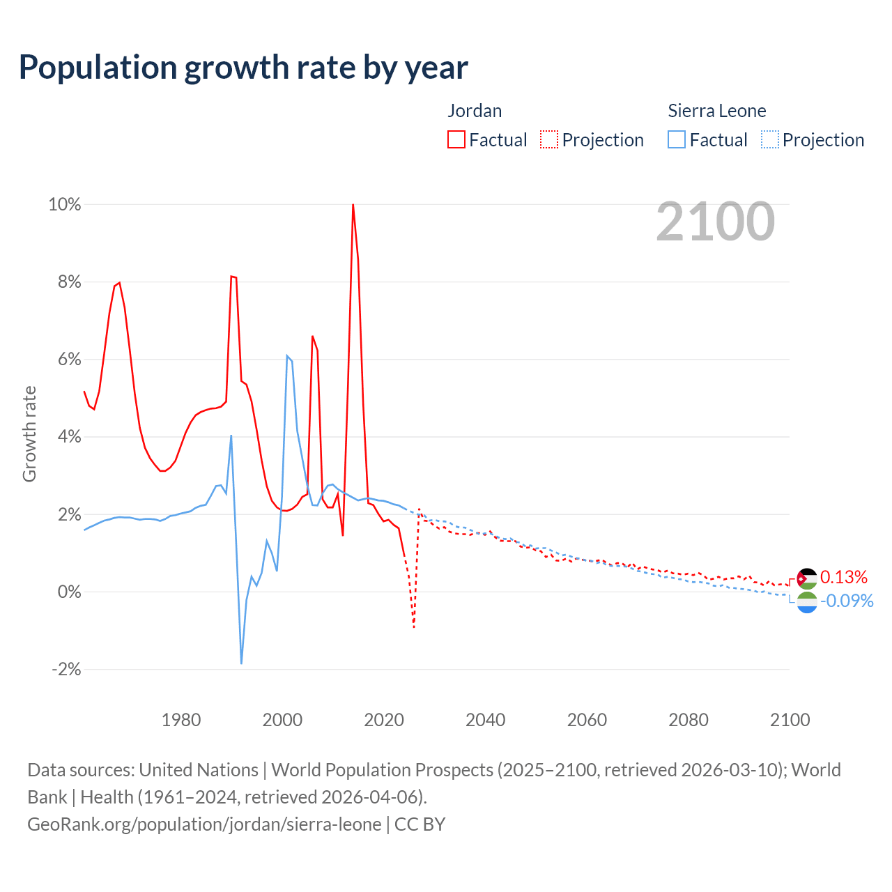 - For the last 10 years, Jordan has had an average growth rate of +3.45% per year vs +2.32% in Sierra Leone.