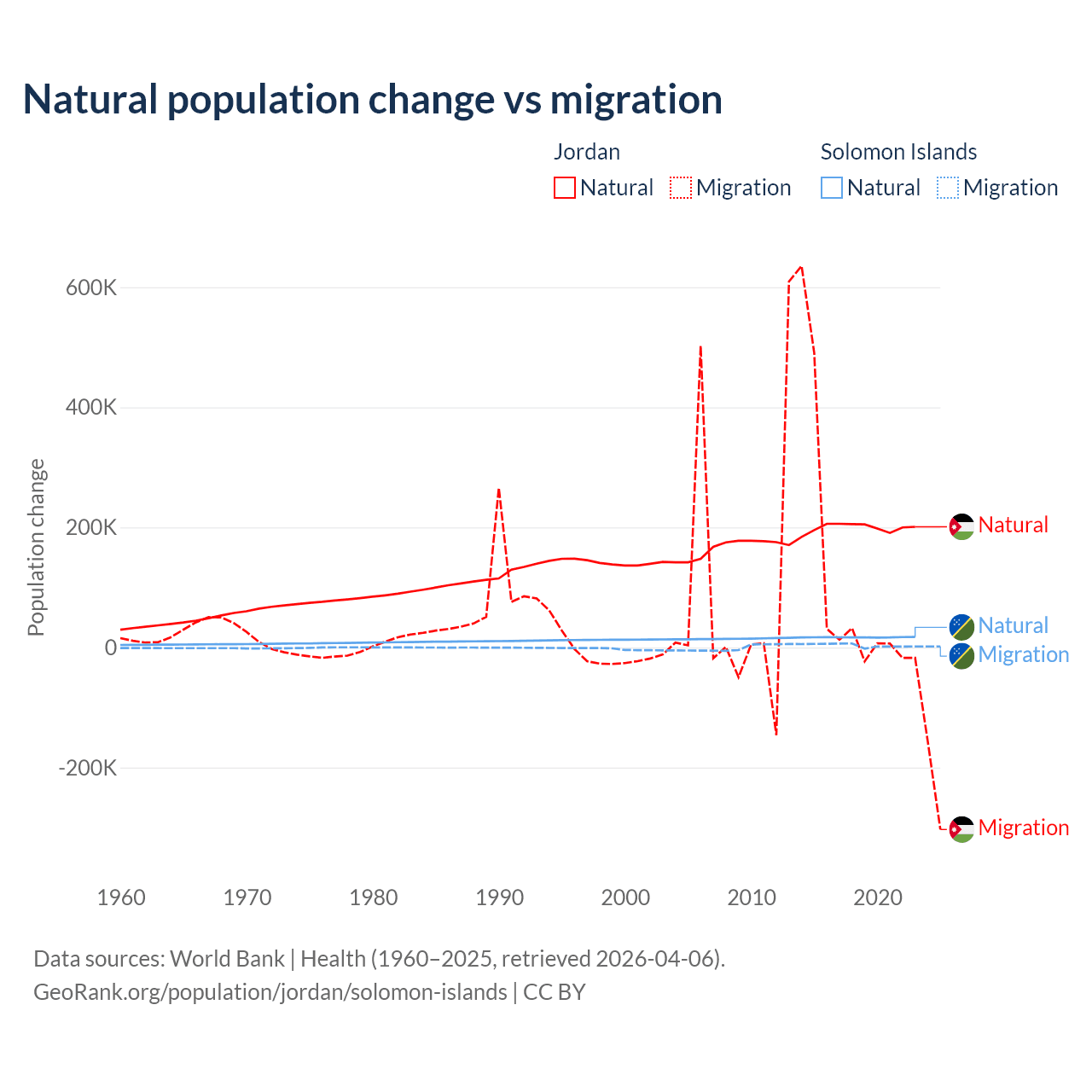 Over the last 10 years, 63.2% of the population change in Jordan is from natural causes (a gain of 1,991,452 people) and 36.8% is from migration (a gain of 1,157,625 people). In the Solomon Islands 82.8% is from natural causes (a gain of 168,727 people) and 17.2% is from migration (a gain of 35,031 people).