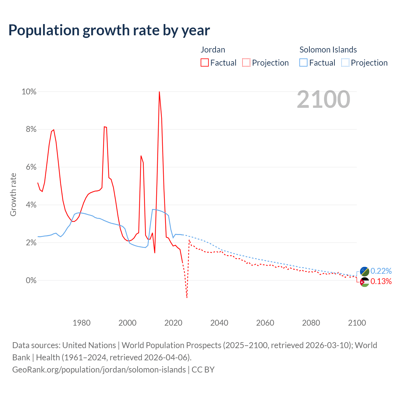 - For the last 10 years, Jordan has had an average growth rate of +3.45% per year vs +2.95% in the Solomon Islands.