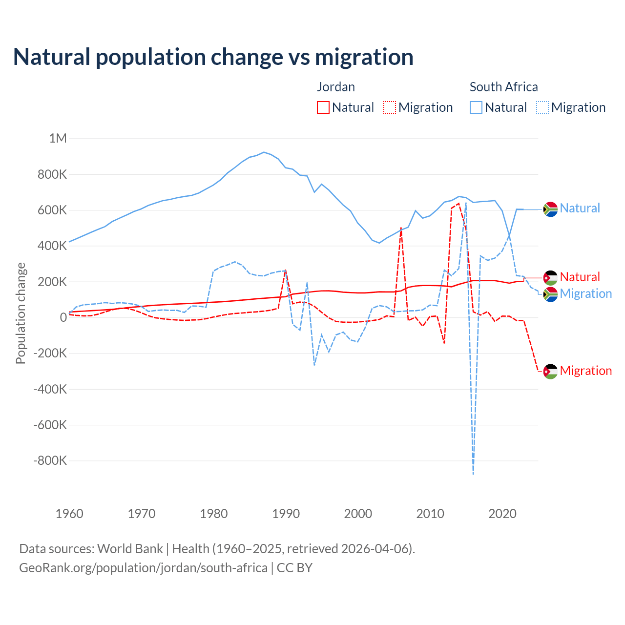 Over the last 10 years, 63.2% of the population change in Jordan is from natural causes (a gain of 1,991,452 people) and 36.8% is from migration (a gain of 1,157,625 people). In South Africa 72.8% is from natural causes (a gain of 6,190,027 people) and 27.2% is from migration (a gain of 2,316,795 people).