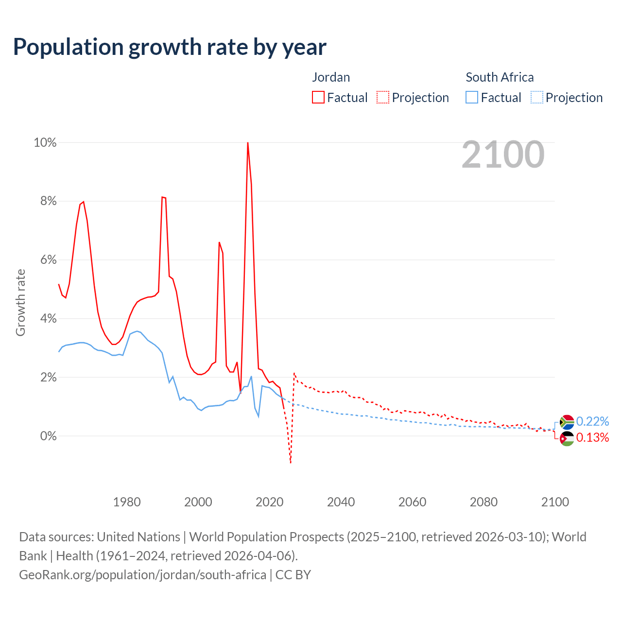 - For the last 10 years, Jordan has had an average growth rate of +3.45% per year vs +1.44% in South Africa.
