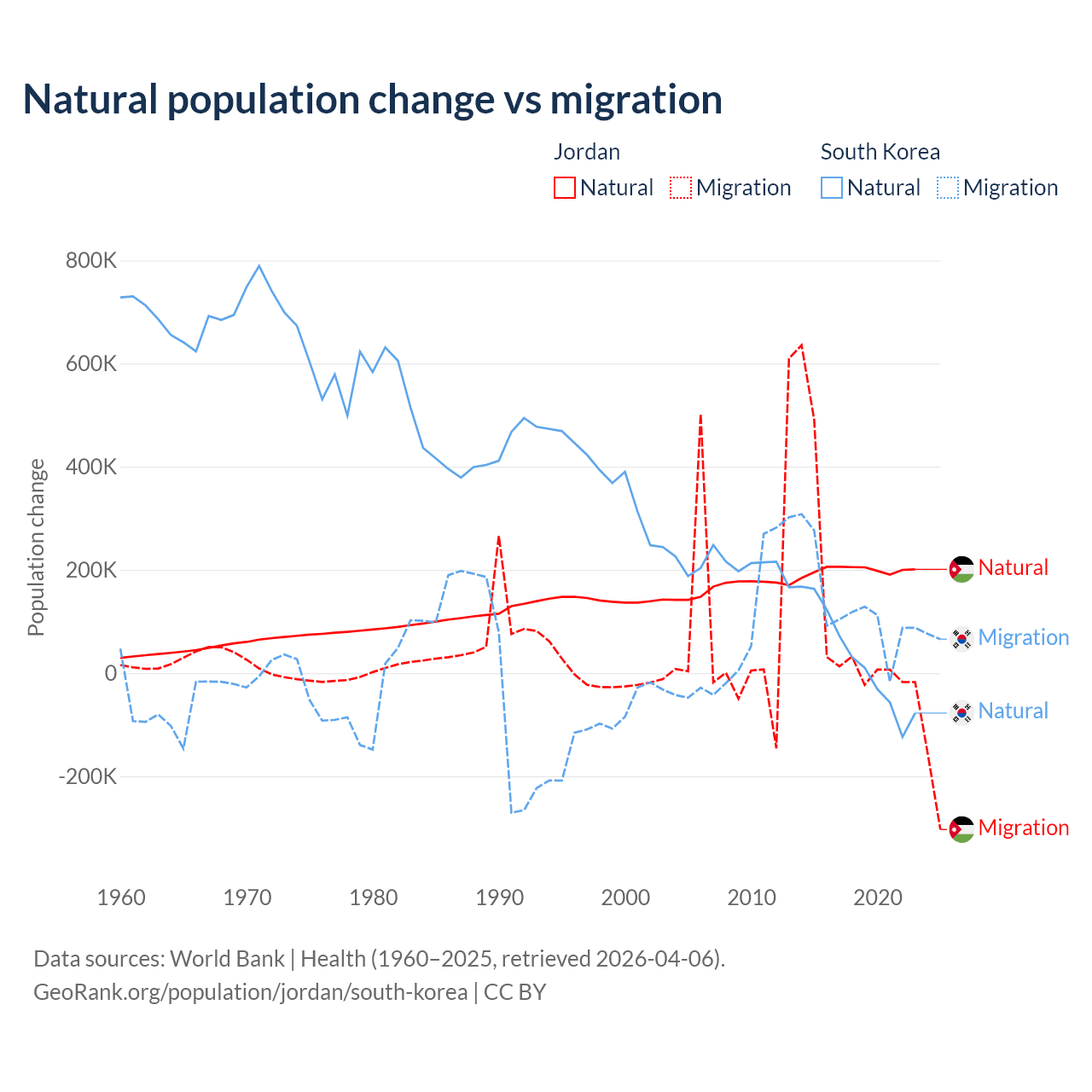 Over the last 10 years, 63.2% of the population change in Jordan is from natural causes (a gain of 1,991,452 people) and 36.8% is from migration (a gain of 1,157,625 people). In South Korea 17.6% is from natural causes (a gain of 277,215 people) and 82.4% is from migration (a gain of 1,298,356 people).