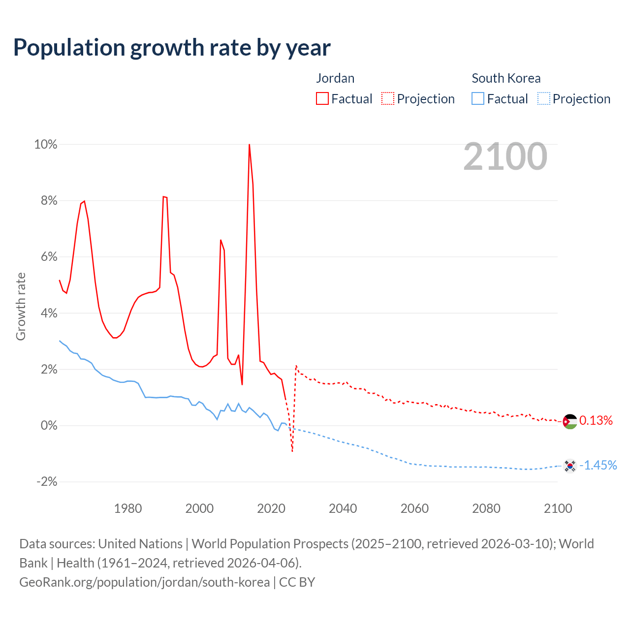 - For the last 10 years, Jordan has had an average growth rate of +3.45% per year vs +0.24% in South Korea.