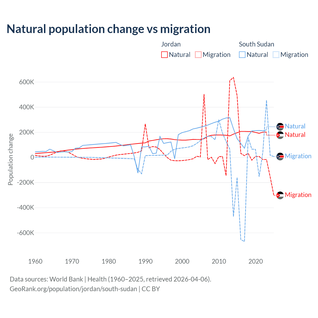 Over the last 10 years, 63.2% of the population change in Jordan is from natural causes (a gain of 1,991,452 people) and 36.8% is from migration (a gain of 1,157,625 people). In South Sudan 57.4% is from natural causes (a gain of 1,792,135 people) and 42.6% is from migration (a loss of 1,329,606 people).