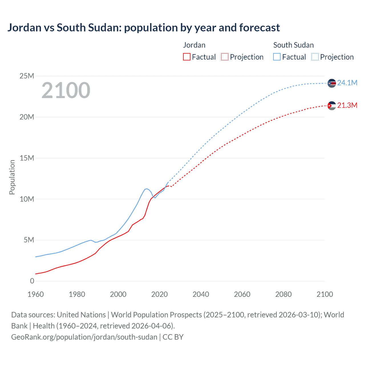 The latest officially reported population of Jordan was 11,552,876 in 2024 vs 11,943,408 people in South Sudan in 2024. In 2026, based on the adjusted UN estimation, the current Jordan's population is 11,555,022 people compared to 12,507,858 in South Sudan.