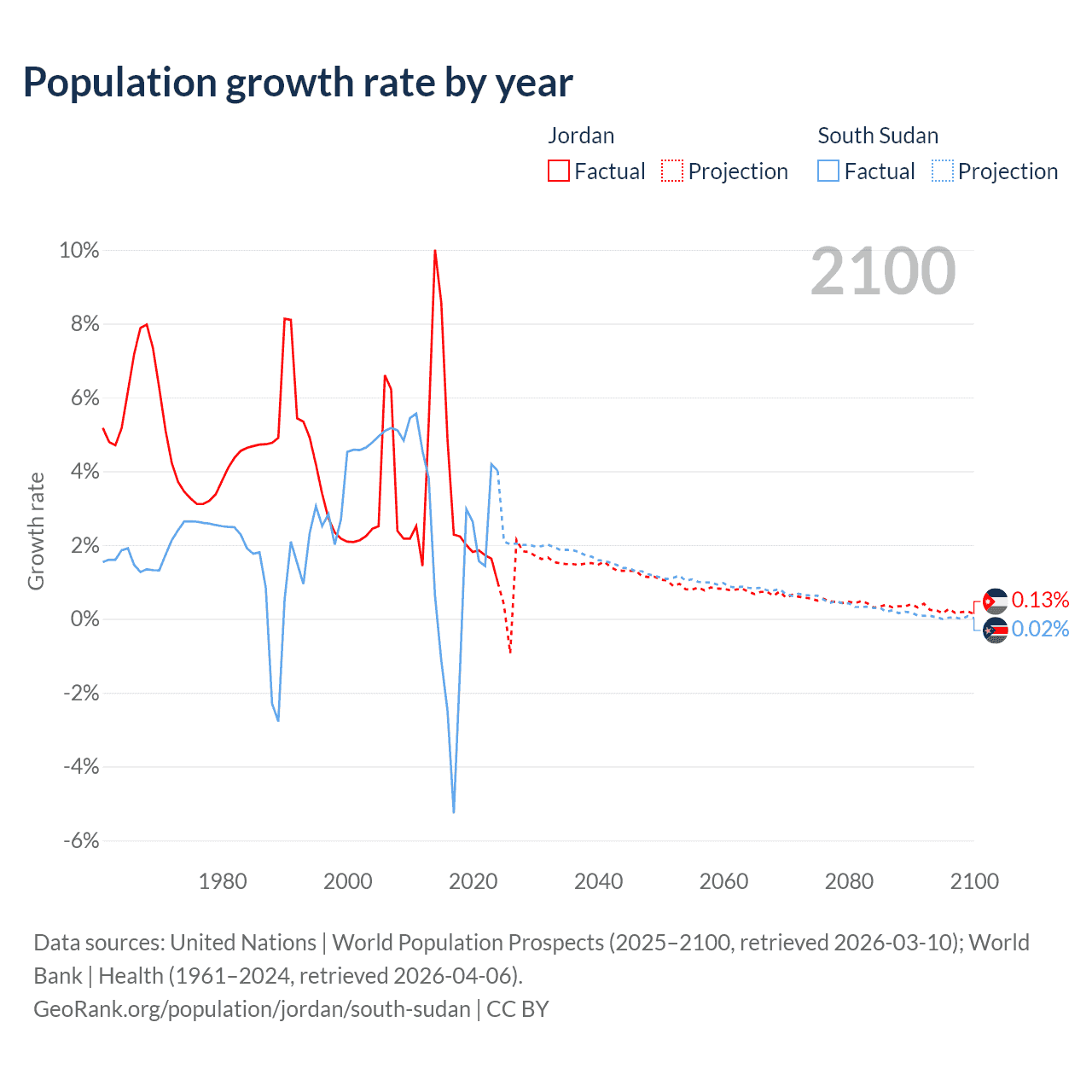 - For the last 10 years, Jordan has had an average growth rate of +3.45% per year vs +0.65% in South Sudan.