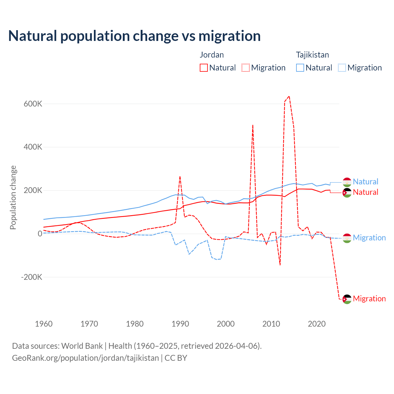Over the last 10 years, 63.2% of the population change in Jordan is from natural causes (a gain of 1,991,452 people) and 36.8% is from migration (a gain of 1,157,625 people). In Tajikistan 96% is from natural causes (a gain of 2,266,045 people) and 3.95% is from migration (a loss of 93,205 people).
