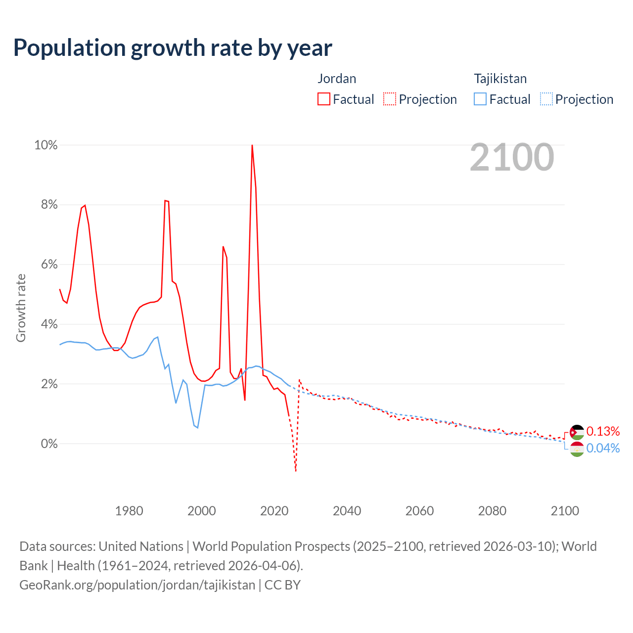 - For the last 10 years, Jordan has had an average growth rate of +3.45% per year vs +2.33% in Tajikistan.