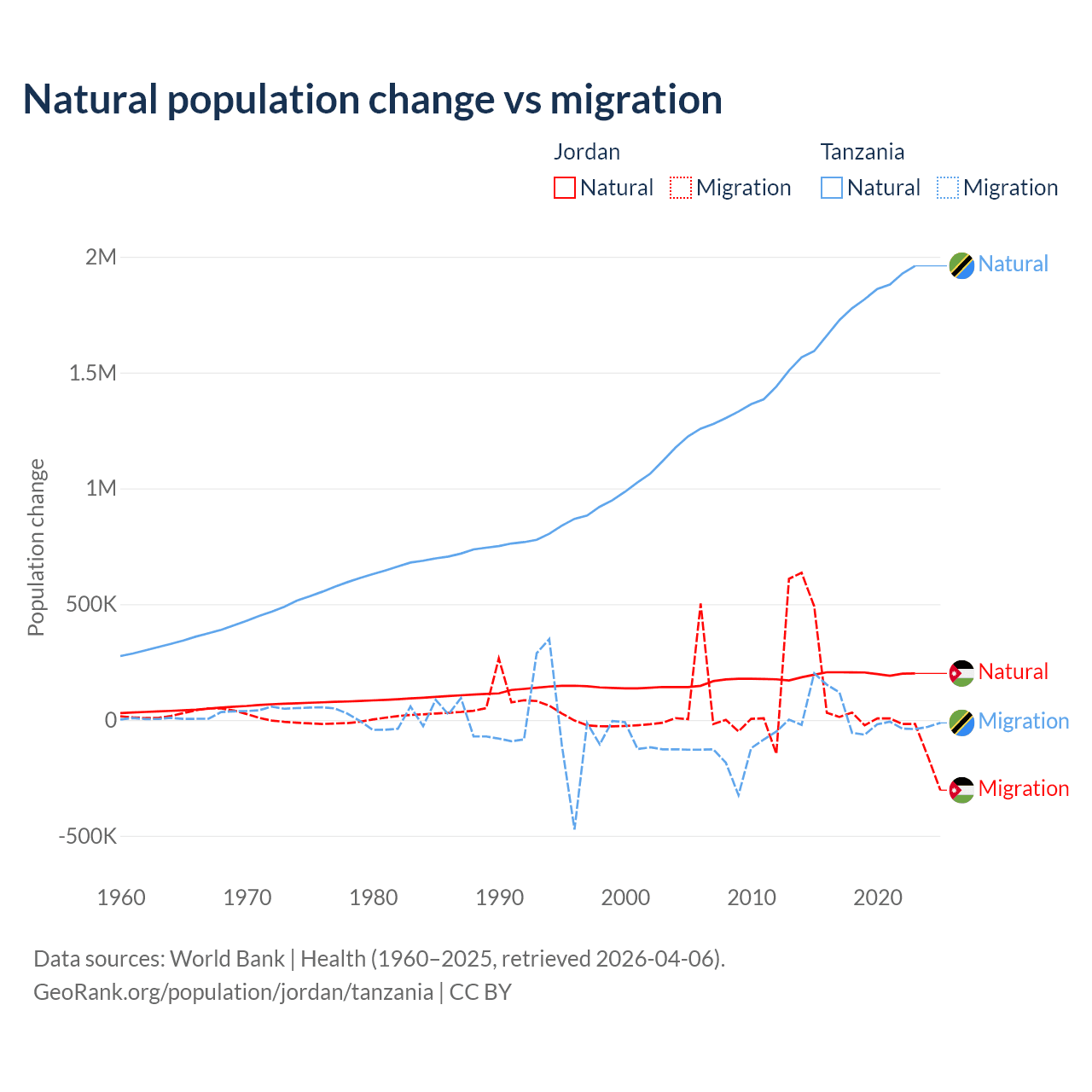 Over the last 10 years, 63.2% of the population change in Jordan is from natural causes (a gain of 1,991,452 people) and 36.8% is from migration (a gain of 1,157,625 people). In Tanzania 98.7% is from natural causes (a gain of 17,769,541 people) and 1.27% is from migration (a gain of 229,466 people).