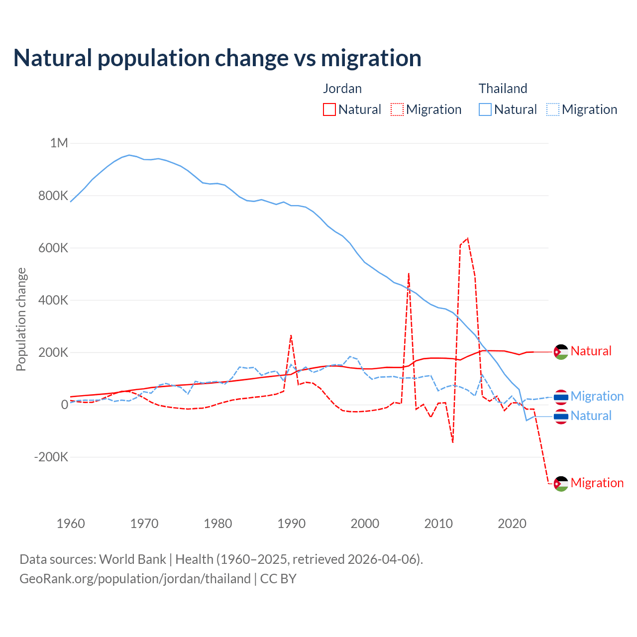 Over the last 10 years, 63.2% of the population change in Jordan is from natural causes (a gain of 1,991,452 people) and 36.8% is from migration (a gain of 1,157,625 people). In Thailand 78.4% is from natural causes (a gain of 1,292,528 people) and 21.6% is from migration (a gain of 355,361 people).
