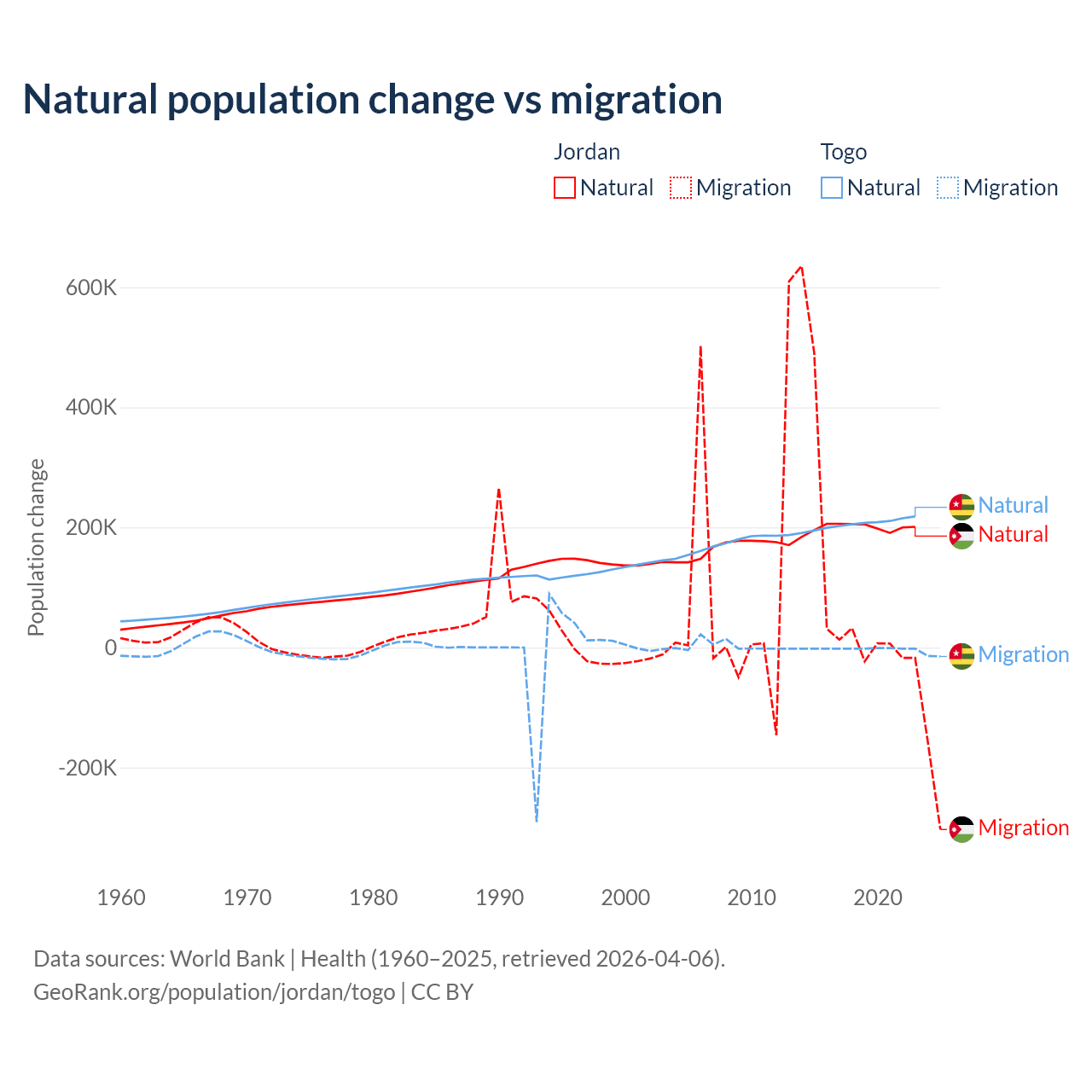 Over the last 10 years, 63.2% of the population change in Jordan is from natural causes (a gain of 1,991,452 people) and 36.8% is from migration (a gain of 1,157,625 people). In Togo 99.1% is from natural causes (a gain of 2,052,115 people) and 0.86% is from migration (a loss of 17,852 people).