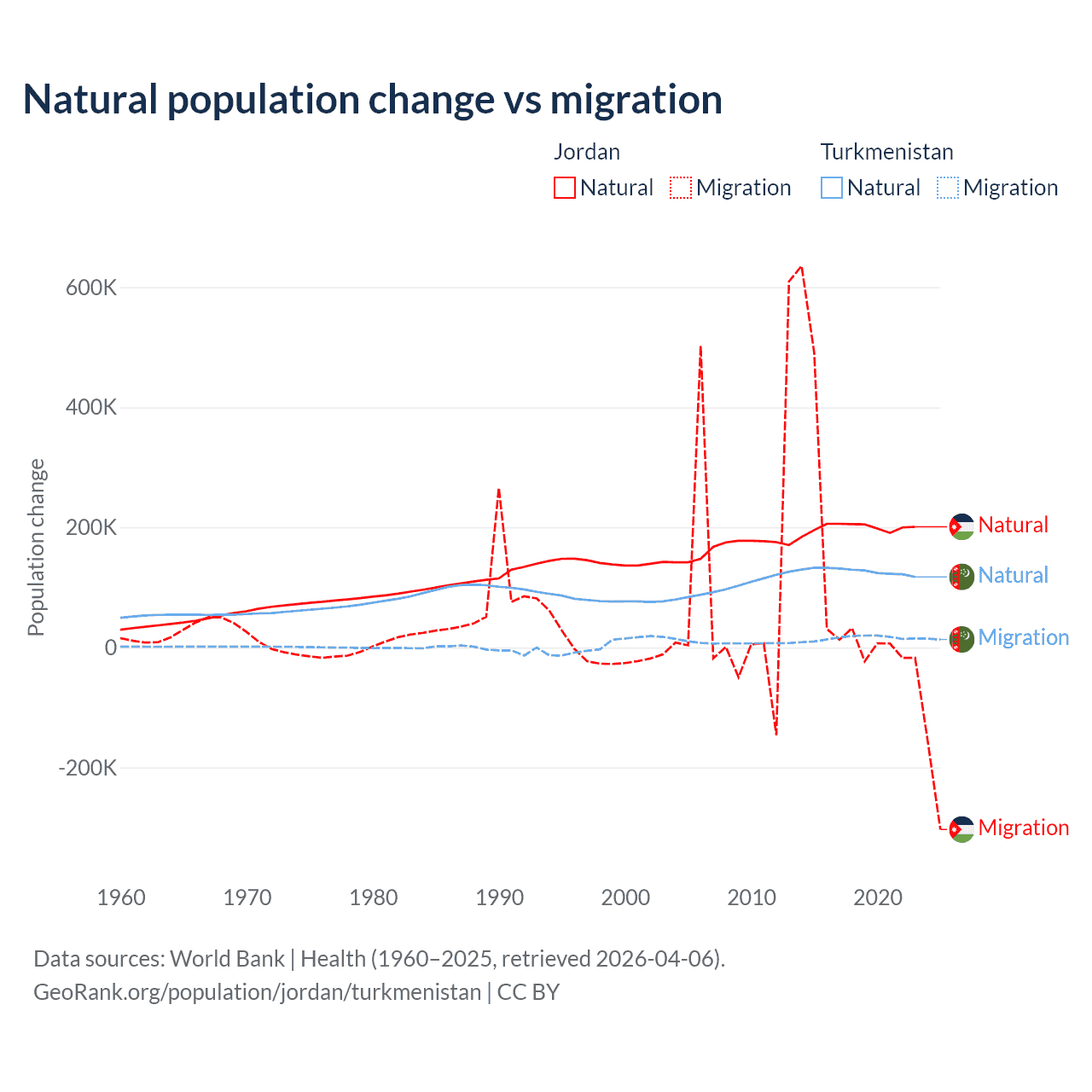 Over the last 10 years, 63.2% of the population change in Jordan is from natural causes (a gain of 1,991,452 people) and 36.8% is from migration (a gain of 1,157,625 people). In Turkmenistan 89.2% is from natural causes (a gain of 1,270,228 people) and 10.8% is from migration (a gain of 154,379 people).