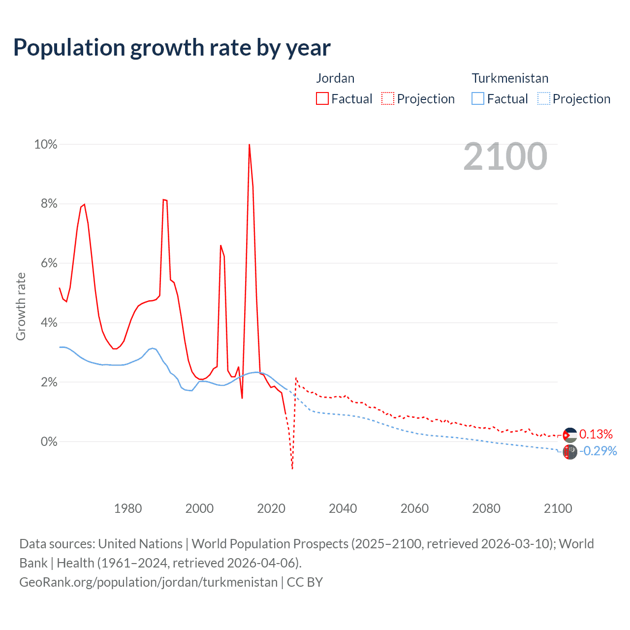 - For the last 10 years, Jordan has had an average growth rate of +3.45% per year vs +2.14% in Turkmenistan.