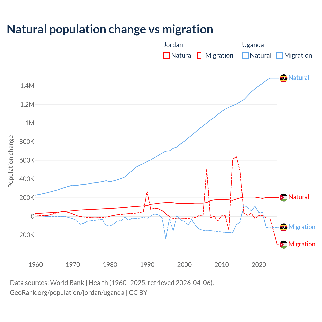 Over the last 10 years, 63.2% of the population change in Jordan is from natural causes (a gain of 1,991,452 people) and 36.8% is from migration (a gain of 1,157,625 people). In Uganda 99.5% is from natural causes (a gain of 13,419,712 people) and 0.53% is from migration (a gain of 71,457 people).
