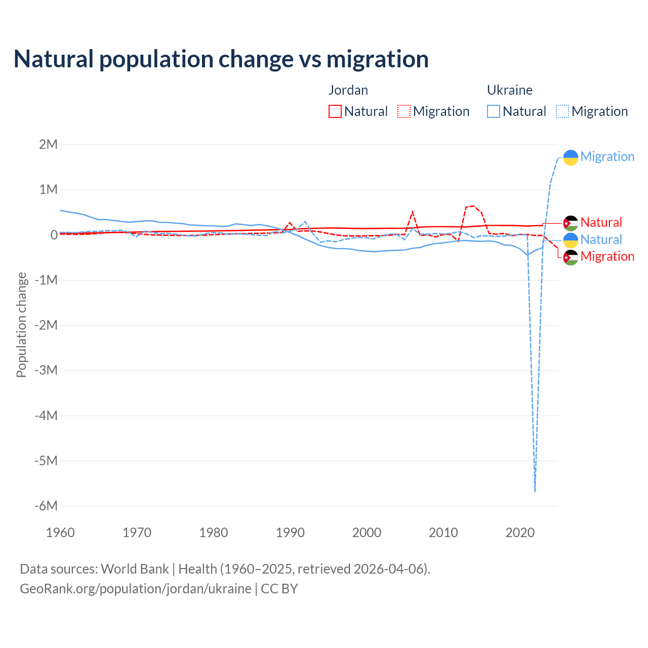 Over the last 10 years, 63.2% of the population change in Jordan is from natural causes (a gain of 1,991,452 people) and 36.8% is from migration (a gain of 1,157,625 people). In Ukraine 28.2% is from natural causes (a loss of 2,435,153 people) and 71.8% is from migration (a loss of 6,198,995 people).