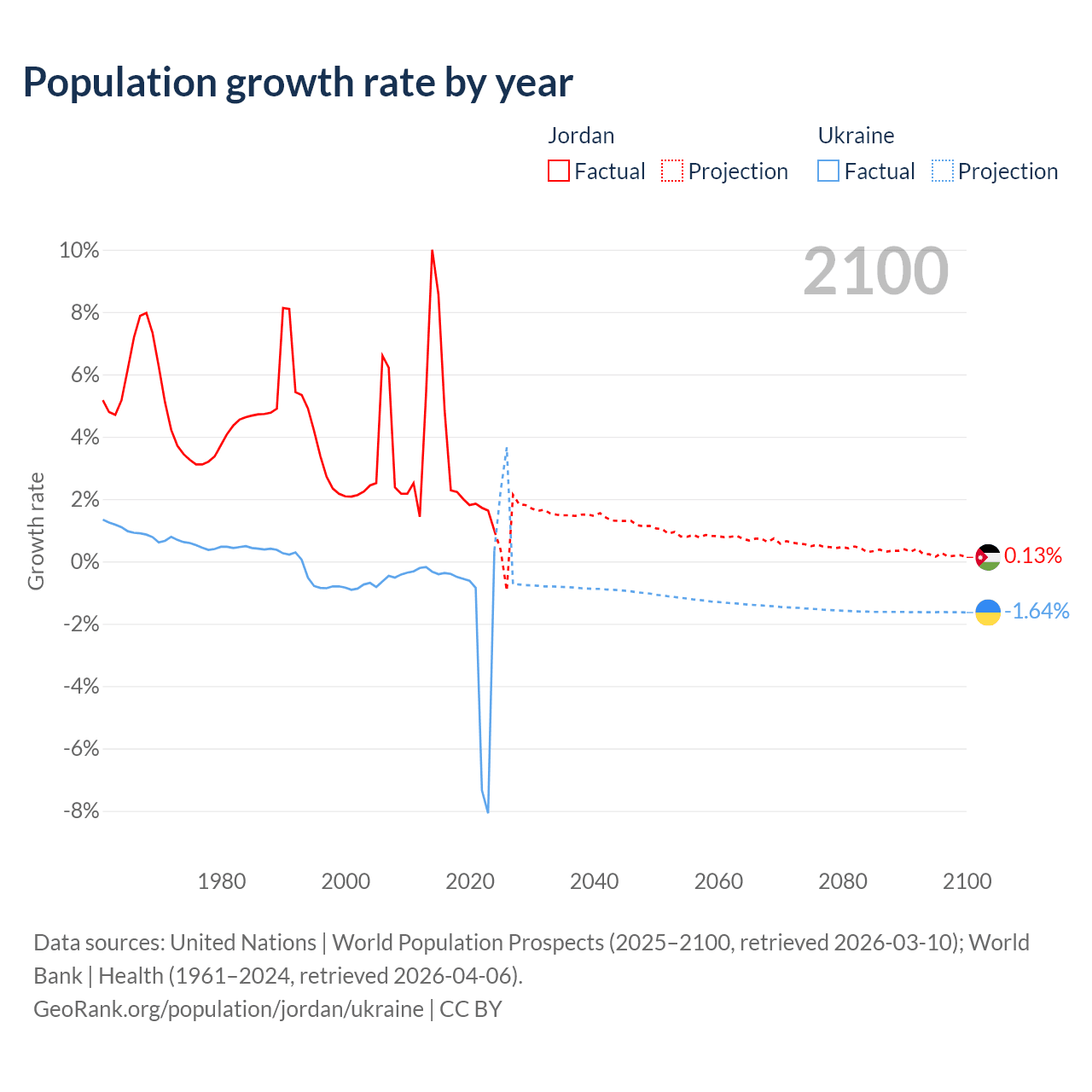 - For the last 10 years, Jordan has had an average growth rate of +3.45% per year vs -1.74% in Ukraine.