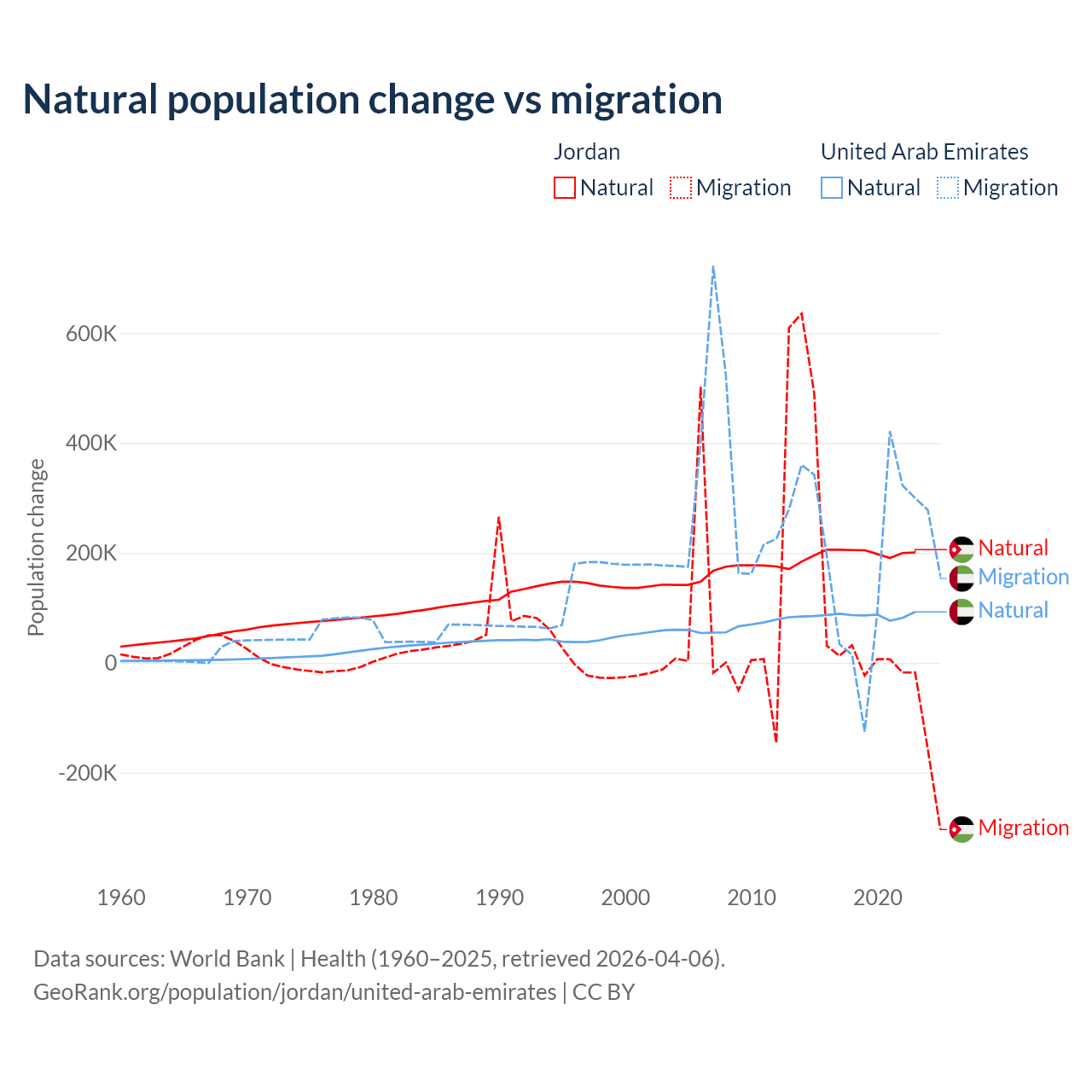Over the last 10 years, 63.2% of the population change in Jordan is from natural causes (a gain of 1,991,452 people) and 36.8% is from migration (a gain of 1,157,625 people). In the United Arab Emirates 30.5% is from natural causes (a gain of 857,996 people) and 69.5% is from migration (a gain of 1,958,520 people).