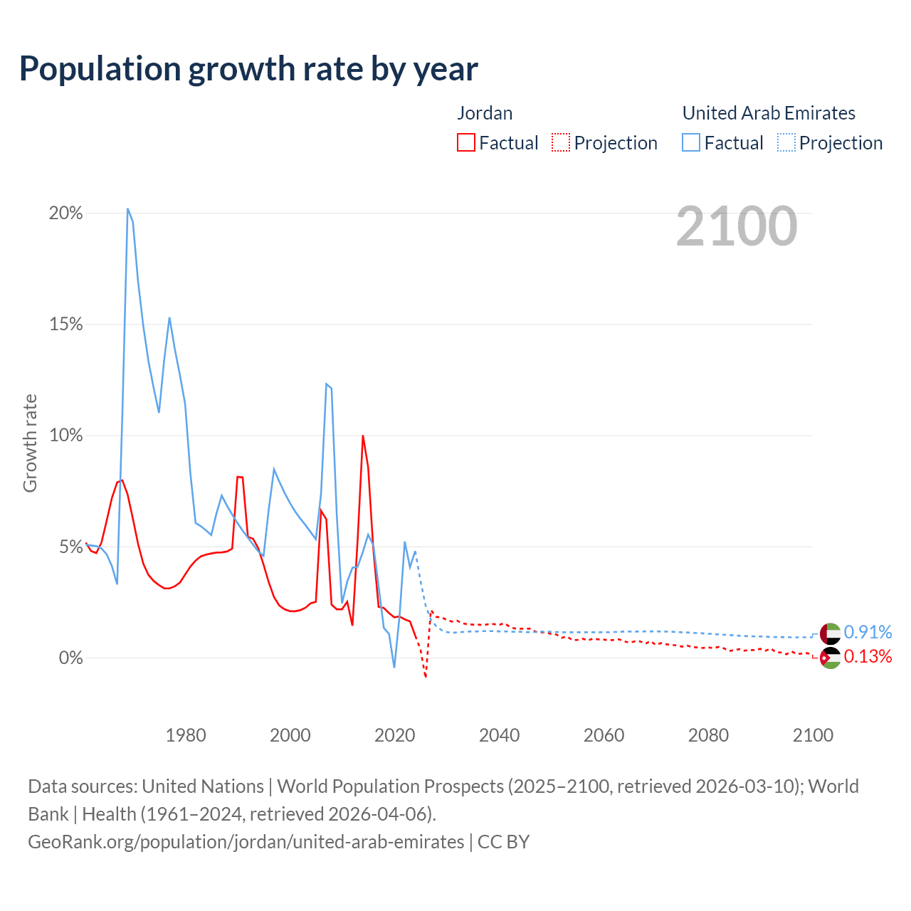- For the last 10 years, Jordan has had an average growth rate of +3.45% per year vs +3.31% in the United Arab Emirates.