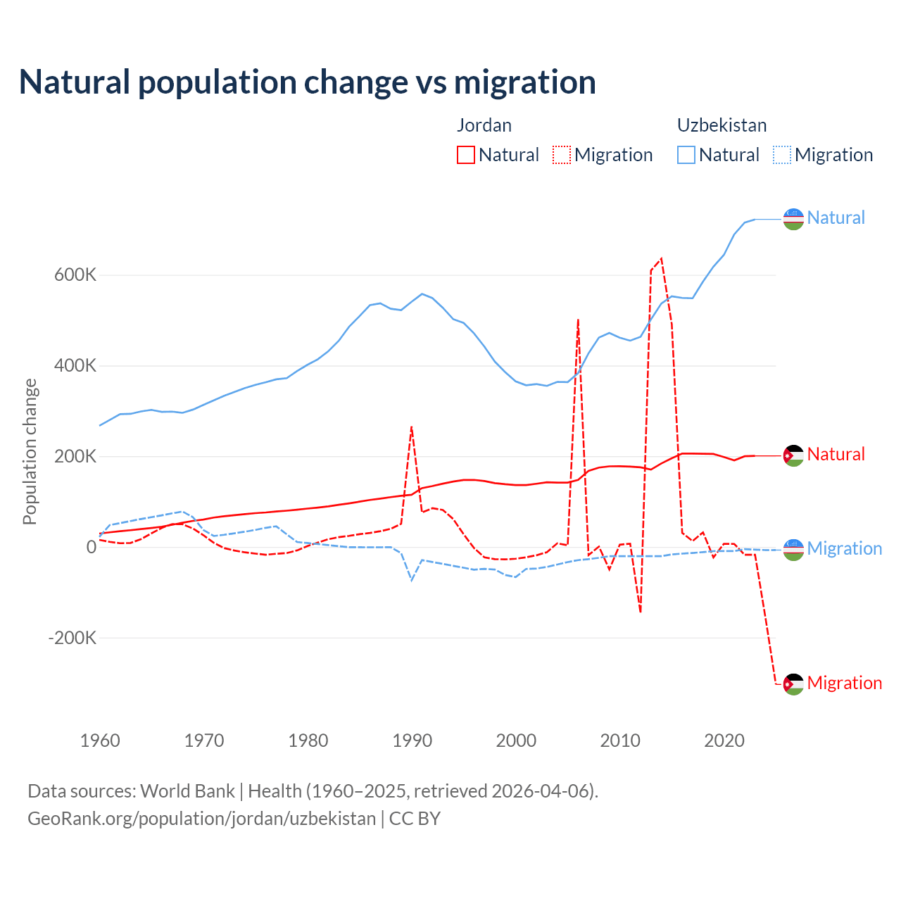 Over the last 10 years, 63.2% of the population change in Jordan is from natural causes (a gain of 1,991,452 people) and 36.8% is from migration (a gain of 1,157,625 people). In Uzbekistan 98.2% is from natural causes (a gain of 6,161,117 people) and 1.84% is from migration (a loss of 115,398 people).