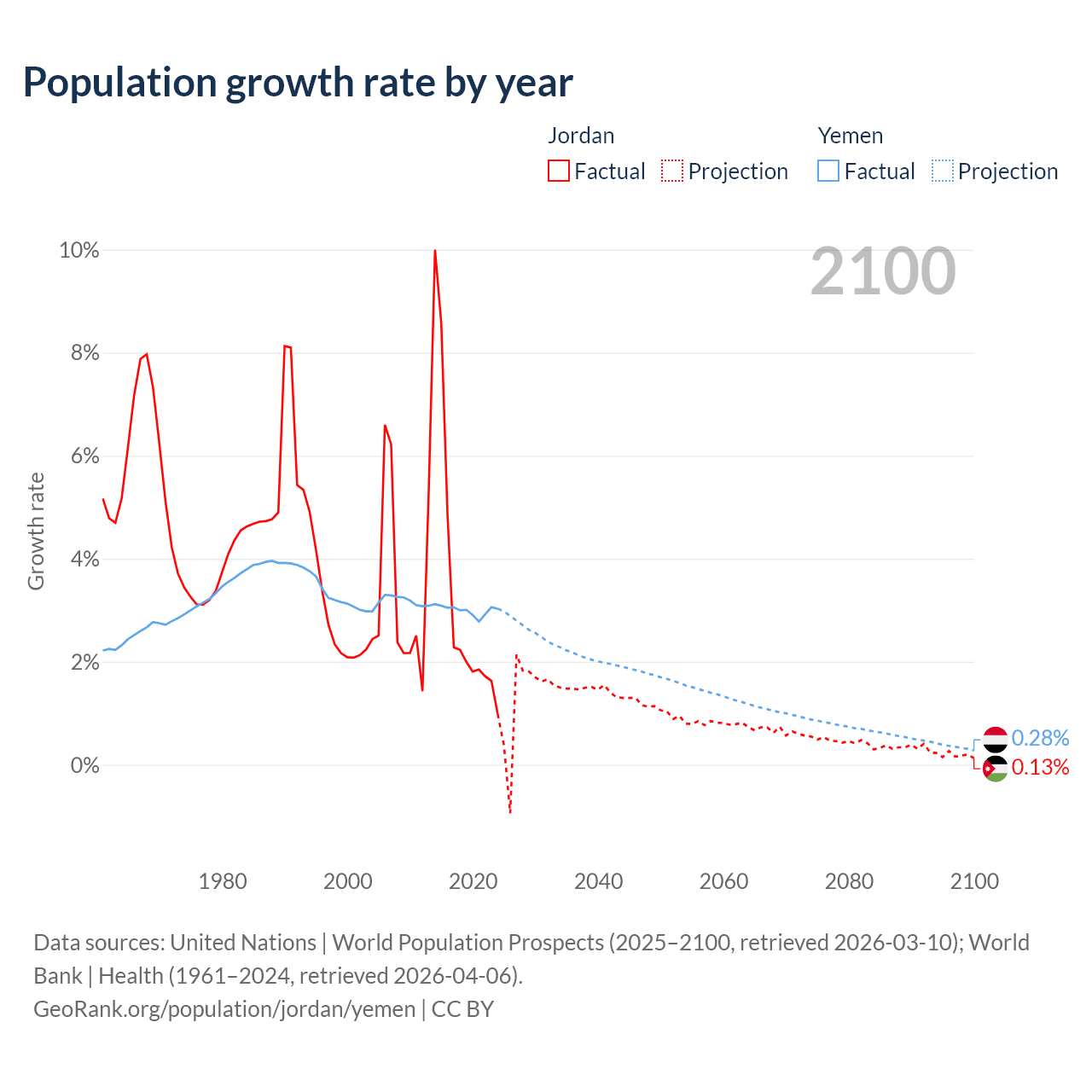 - For the last 10 years, Jordan has had an average growth rate of +3.45% per year vs +3% in Yemen.
