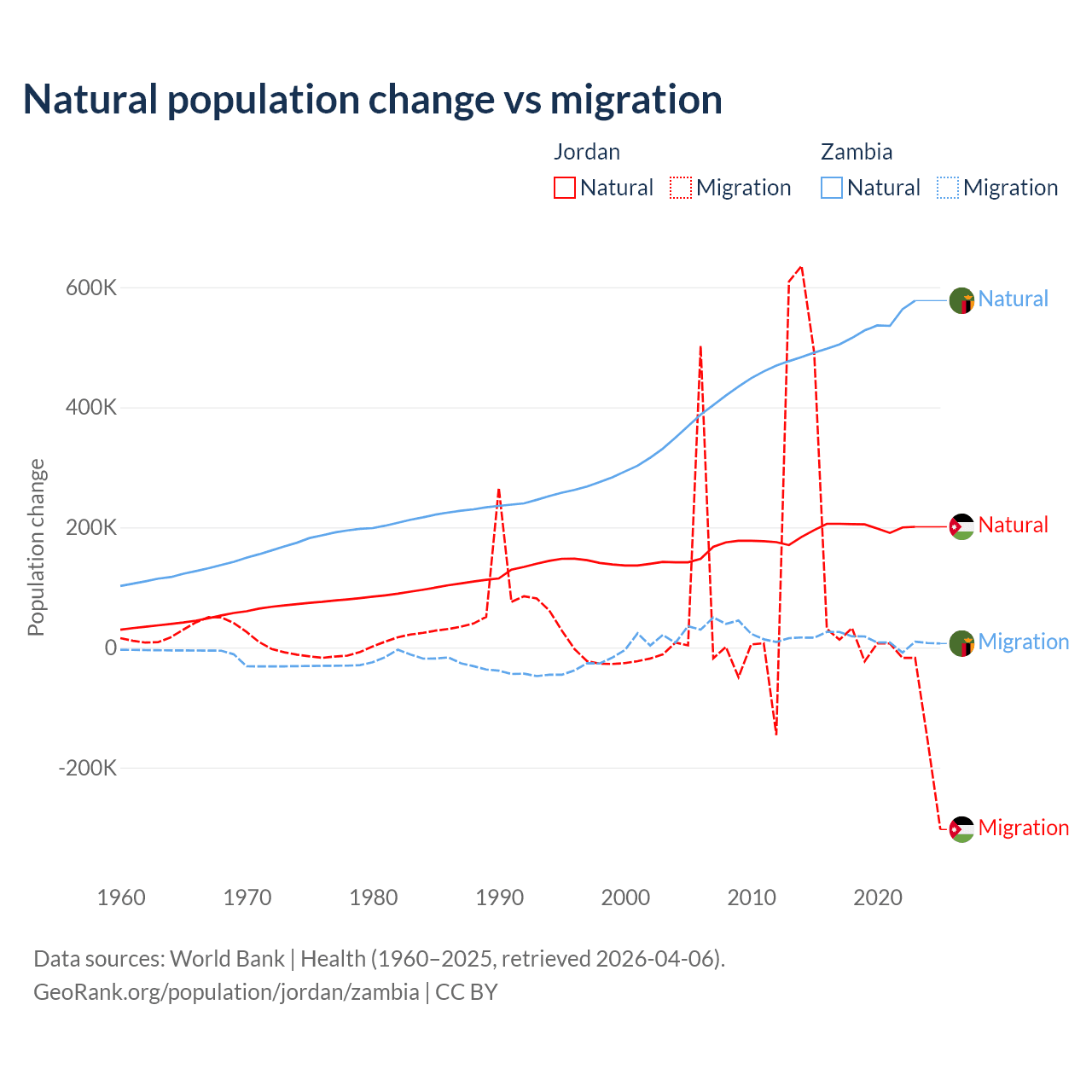 Over the last 10 years, 63.2% of the population change in Jordan is from natural causes (a gain of 1,991,452 people) and 36.8% is from migration (a gain of 1,157,625 people). In Zambia 97.4% is from natural causes (a gain of 5,233,797 people) and 2.58% is from migration (a gain of 138,554 people).