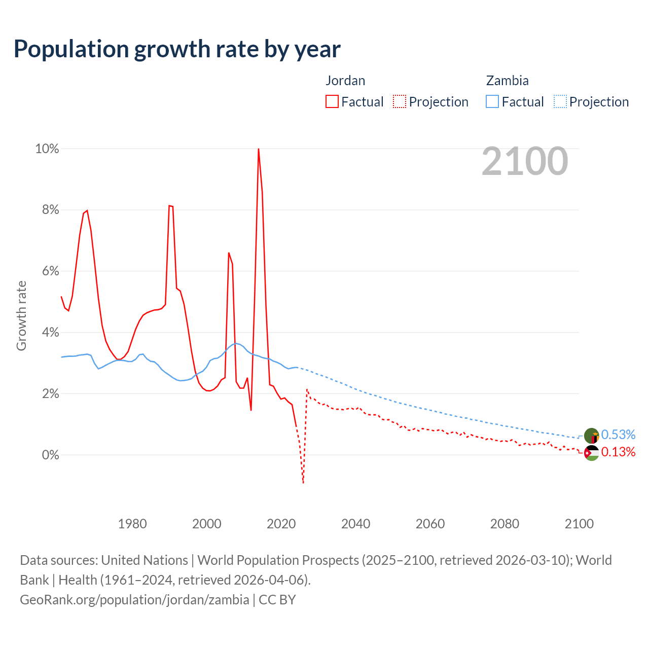 - For the last 10 years, Jordan has had an average growth rate of +3.45% per year vs +3% in Zambia.