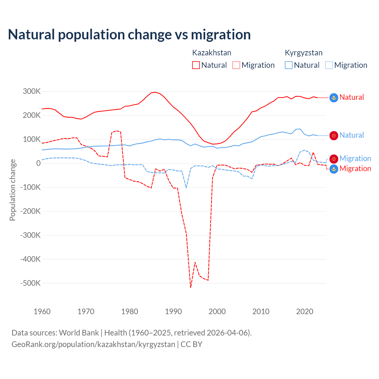 Over the last 10 years, 98.7% of the population change in Kazakhstan is from natural causes (a gain of 2,743,094 people) and 1.33% is from migration (a gain of 36,908 people). In Kyrgyzstan 88.5% is from natural causes (a gain of 1,258,837 people) and 11.5% is from migration (a gain of 164,132 people).