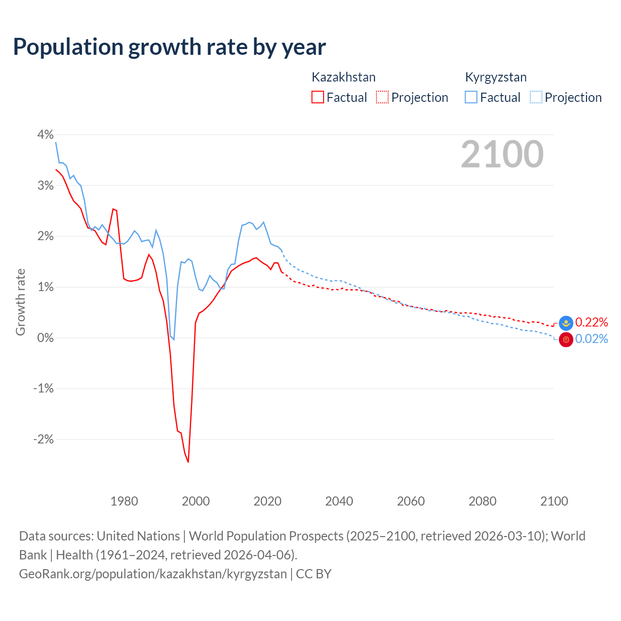 - For the last 10 years, Kazakhstan has had an average growth rate of +1.46% per year vs +2.05% in Kyrgyzstan.